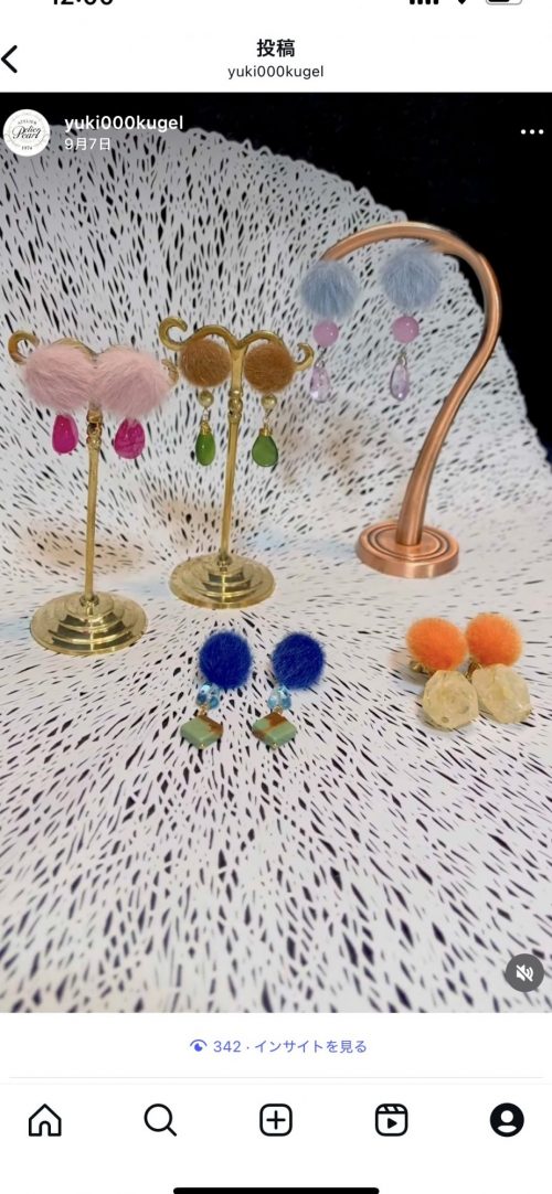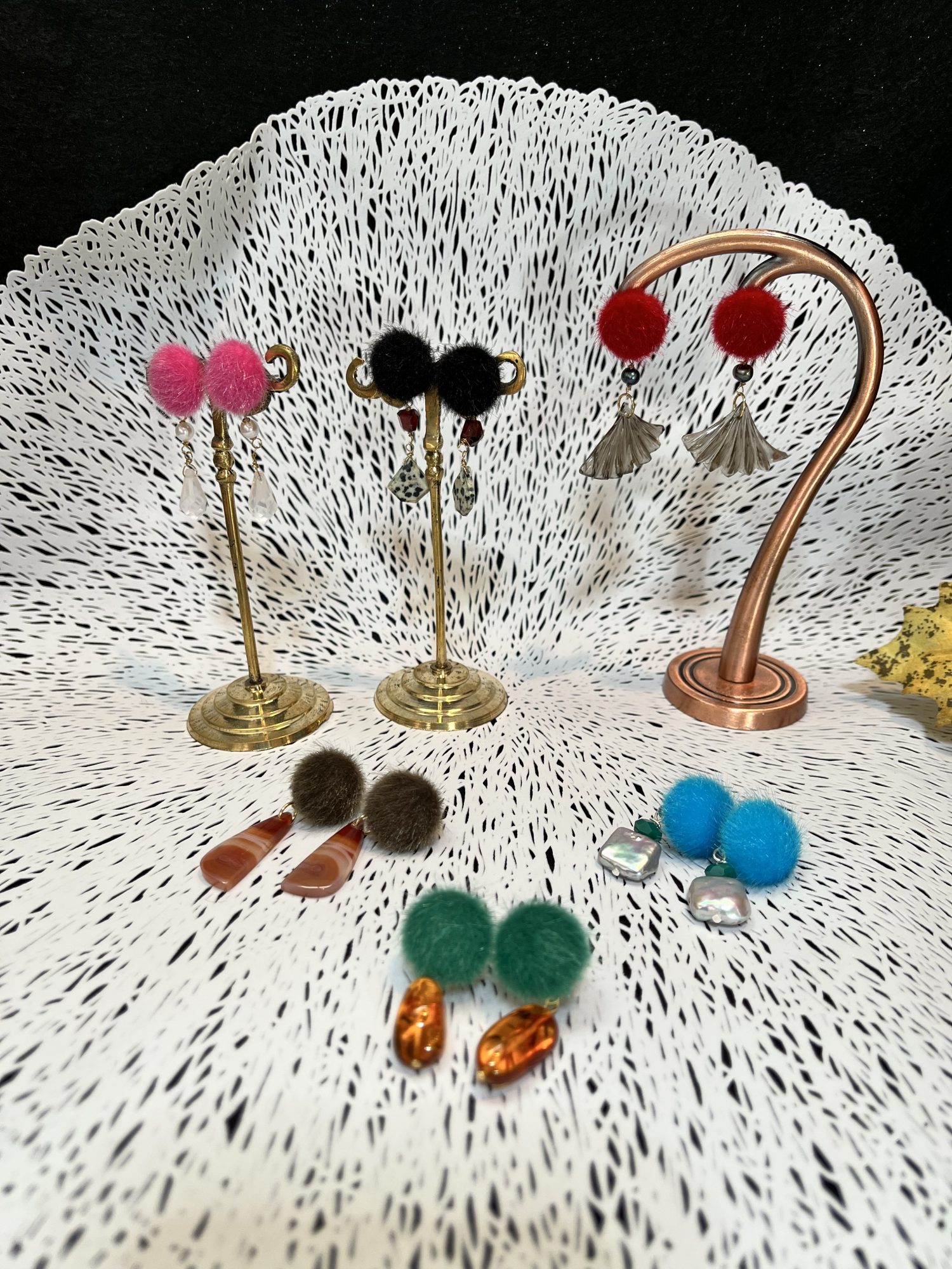 こちらはフェイクファーカボションに天然石や淡水パールを組み合わせた、秋冬物のピアス、イヤリングです。