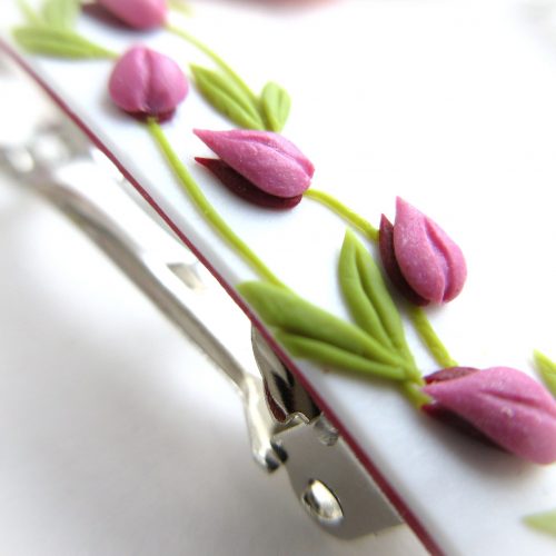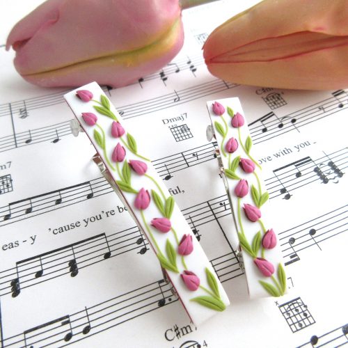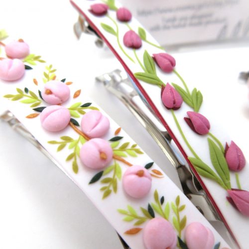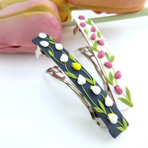 ポリマークレイで作る、個性的でぷっくり可愛いキュートなチューリップのバレッタです。焼成すると軽くて丈夫になるので、重さも5g程度と軽く、着け心地も良いです。
