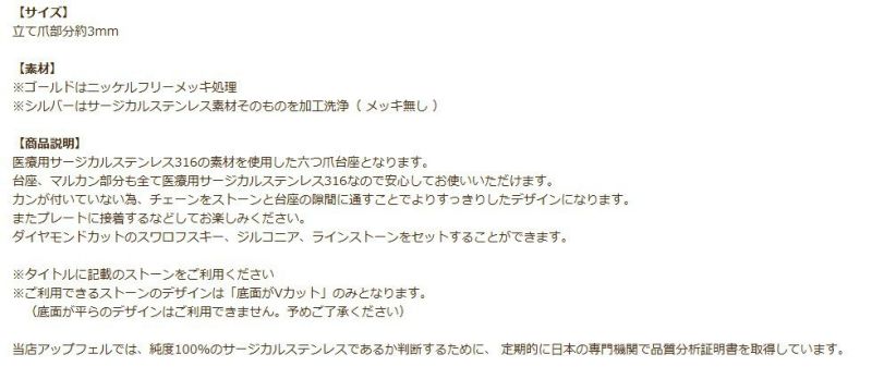 医療用サージカルステンレス316の素材を使用した六つ爪台座となります。
