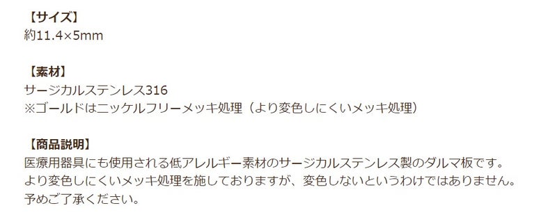 医療用器具にも使用される低アレルギー素材のサージカルステンレス製のダルマ板です。