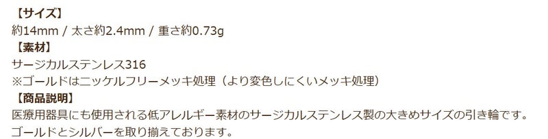 医療用器具にも使用される低アレルギー素材のサージカルステンレス製の大きめサイズの引き輪です。