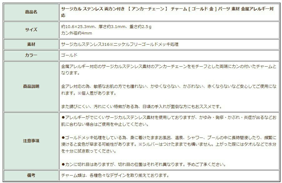 他の画像を見る 金アレ 316 チャーム ニッケルフリー アンカーチェーン 敏感肌 [ 1個 ] 両カン付き 【 アンカーチェーン 】 チャーム [ ゴールド 金 ] サージカル ステンレス パーツ 素材 金属アレルギー対応 当店特別価格 ¥ 349 税込 カートに入れる お気に入りに登録する