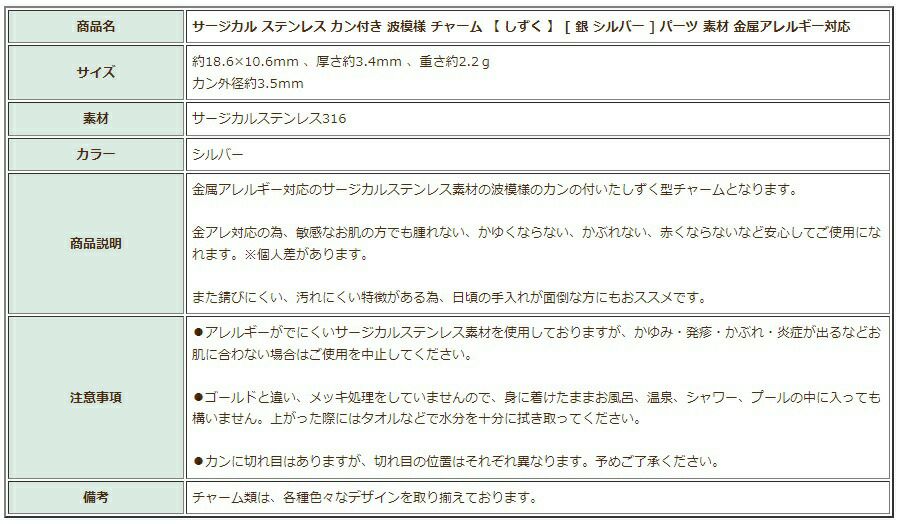 他の画像を見る 金アレ 316 チャーム ニッケルフリー 波模様 しずく 敏感肌 [ 2個 ] サージカル ステンレス カン付き 波模様 チャーム 【 しずく 】 [ 銀 シルバー ] パーツ 素材 金属アレルギー対応 当店特別価格 ¥ 758 税込 カートに入れる お気に入りに登録する