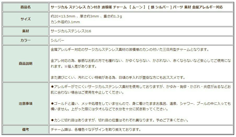他の画像を見る 金アレ 316 チャーム ニッケルフリー 波模様 しずく 敏感肌 [ 1個 ] サージカル ステンレス カン付き 波模様 チャーム 【 ムーン 】 [ 銀 シルバー ] パーツ 素材 金属アレルギー対応 当店特別価格 ¥ 369 税込 カートに入れる お気に入りに登録する