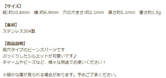 他の画像を見る 金アレ 素材 材料 ニッケルフリー 敏感肌 チャーム モチーフ [4個] 304 チャーム C2003 両穴 ビーンズ [ 銀 シルバー ] ステンレス パーツ 変形 シンプル 魔法陣 金属アレルギー対応 O-03 当店特別価格 ¥ 299 税込 カートに入れる お気に入りに登録する