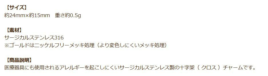 他の画像を見る 金アレ 医療用 316 金具 さびにくい ペンダントトップ 真空 フラット クロス 十字架 チャーム [ ゴールド 金 ] サージカルステンレス パーツ 素材 金属アレルギー対応 O-01 当店特別価格 ¥ 299 税込 〜 当店特別価格 ¥ 税込 詳細を見る お気に入りに登録する