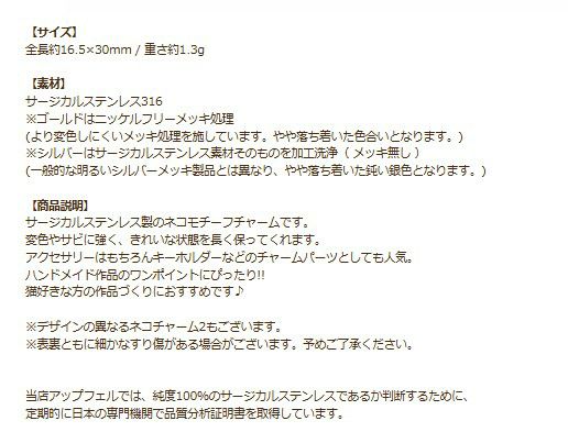他の画像を見る 金アレ 316 ステンレス チャーム 動物モチーフ ハンドメイド素材 ネコ チャーム 1 選べる カラー 個数 ゴールド シルバー ねこ モチーフ 猫 charm サージカルステンレス パーツ 素材 金属アレルギー対応 O-01 当店特別価格 ¥ 239 税込 〜 当店特別価格 ¥ 税込 詳細を見る お気に入りに登録する