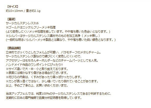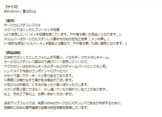 他の画像を見る 金アレ 316 ステンレス チャーム 花 モチーフ ハンドメイド素材 薔薇 メタル チャーム * 小 * ぷっくり 立体 選べる カラー 個数 ゴールド シルバー フラワー 花 ローズ バラ モチーフ charm サージカルステンレス パーツ 素材 金属アレルギー対応 O-01 当店特別価格 ¥ 199 税込 〜 当店特別価格 ¥ 税込 詳細を見る お気に入りに登録する