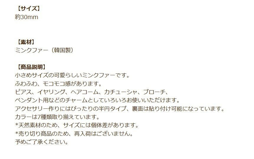 他の画像を見る 半円 チャーム 貼付け カボション もこもこ 天然 [8個] ミンクファー 3センチ 選べるカラー チャーム 貼付け カボション もこもこ ミニファー 天然 ピアス イヤリング パーツ 韓国 素材 O-03 当店特別価格 ¥ 404 税込 カートに入れる お気に入りに登録する
