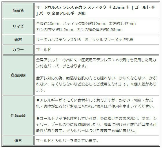 他の画像を見る 金属アレルギー対応 医療用 素材 316 バーパーツ スティック [4個] サージカルステンレス 両カン スティック 《 23mm 》 [ ゴールド 金 ] パーツ 金属アレルギー対応 当店特別価格 ¥ 349 税込 カートに入れる お気に入りに登録する