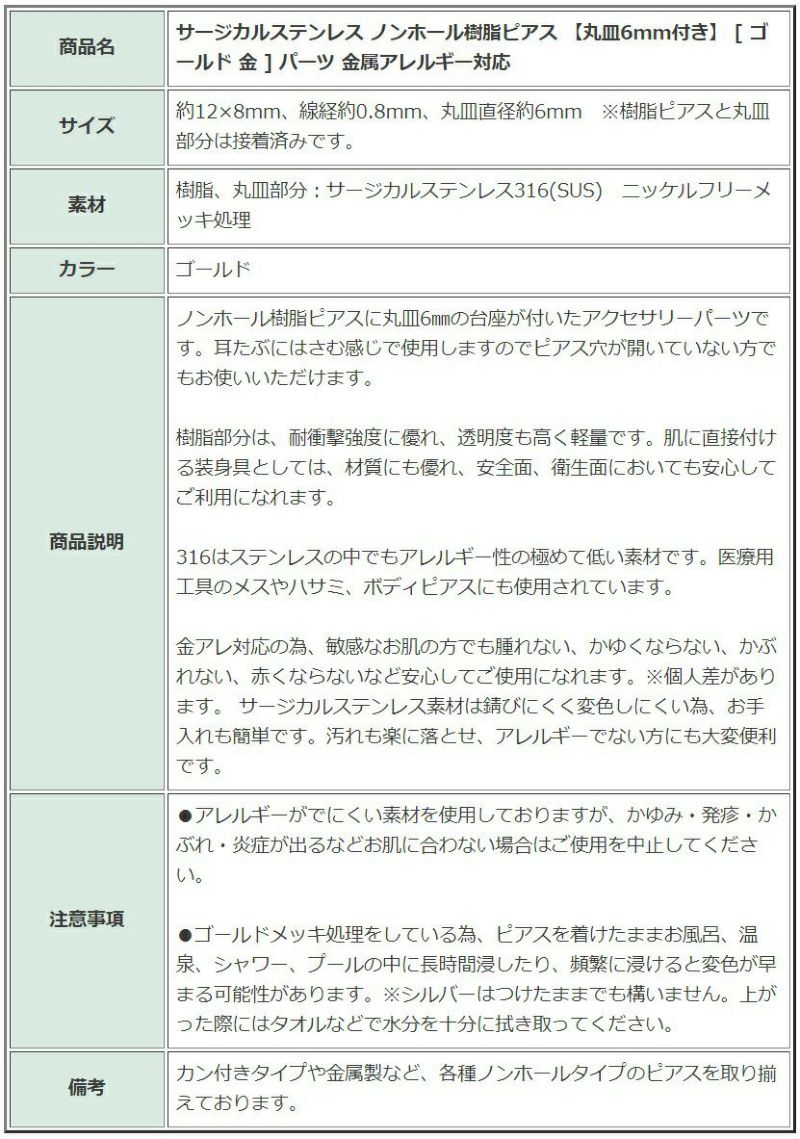 商品名 サージカルステンレス ノンホール樹脂ピアス 【丸皿6mm付き】 [ ゴールド 金 ] パーツ 金属アレルギー対応