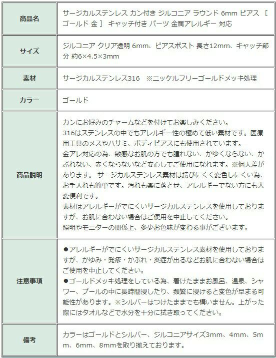 他の画像を見る 金属アレルギー 台座 6爪 スワロ ストーン フォセットカット [4個]サージカルステンレス ヨコ向きカン付き ジルコニア ラウンド 3mm ピアス [ ゴールド 金 ] キャッチ付き パーツ 金属アレルギー 対応 当店特別価格 ¥ 799 税込 カートに入れる お気に入りに登録する
