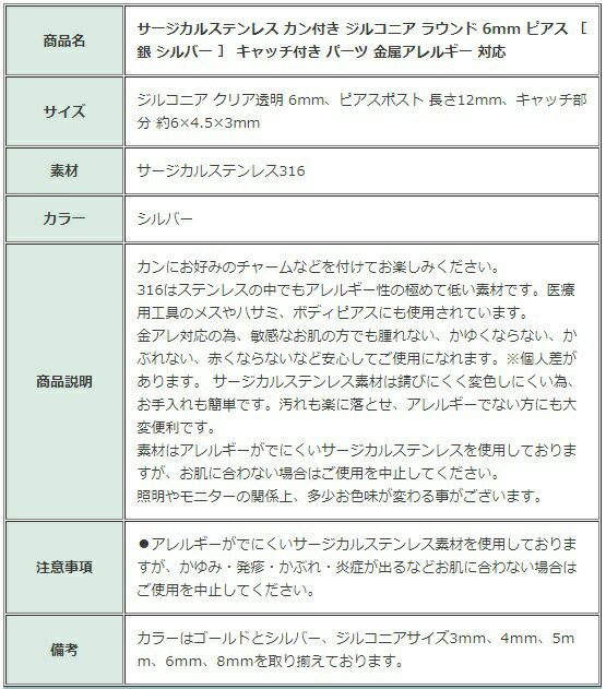 他の画像を見る 金属アレルギー 台座 6爪 スワロ ストーン フォセットカット [4個]サージカルステンレス ヨコ向きカン付き ジルコニア ラウンド 5mm ピアス [ 銀 シルバー ] キャッチ付き パーツ 金属アレルギー 対応 当店特別価格 ¥ 899 税込 カートに入れる お気に入りに登録する