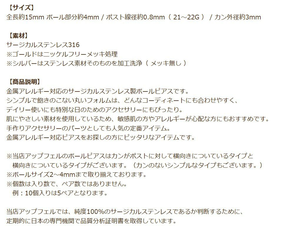 他の画像を見る 金属アレルギー 医療用 素材 お手入れ簡単 316 低アレルギー [10個] 【 ポストのみ 】 縦向きカン付き ボールピアス 3mm [ 銀 シルバー ] サージカルステンレス パーツ 金属アレルギー対応 P2-01 当店特別価格 ¥ 290 税込 カートに入れる お気に入りに登録する