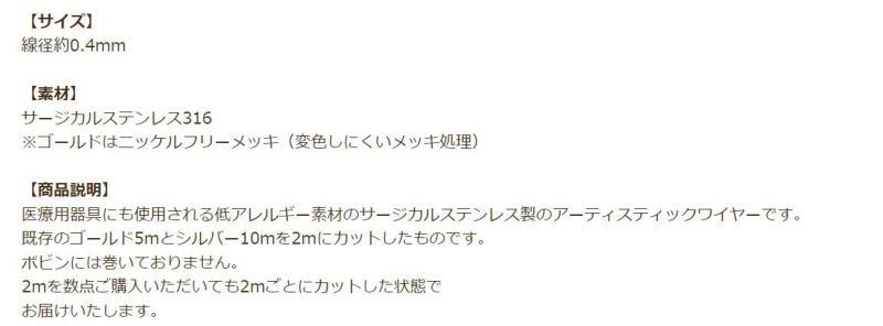 [約2m] * 切り売り * [ 26G ] アーティスティックワイヤー 0.4mm [ ゴールド 金 ] サージカルステンレス ワイヤーワーク ワイヤーアート パーツ 金属アレルギー対応 M2-03