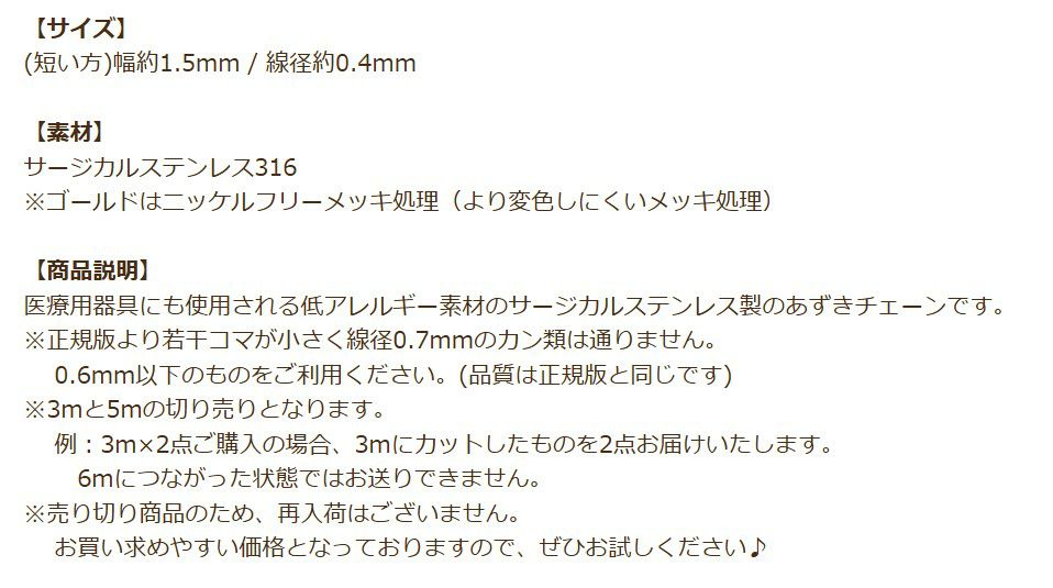 他の画像を見る 金アレ 素材 チェーン 316 ネックレス ブレスレット ニッケルフリー 敏感肌 長め 【 訳アリ 】 小豆チェーン 1.5mm 切り売り 3m 5m [ ゴールド 金 ] サージカルステンレス 選べる長さ チェーンのみ アズキチェーン パーツ C1-01 金属アレルギー対応 当店特別価格 ¥ 1,089 税込 〜 当店特別価格 ¥ 税込 詳細を見る お気に入りに登録する