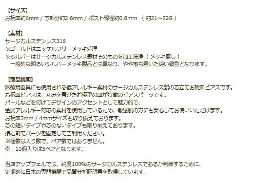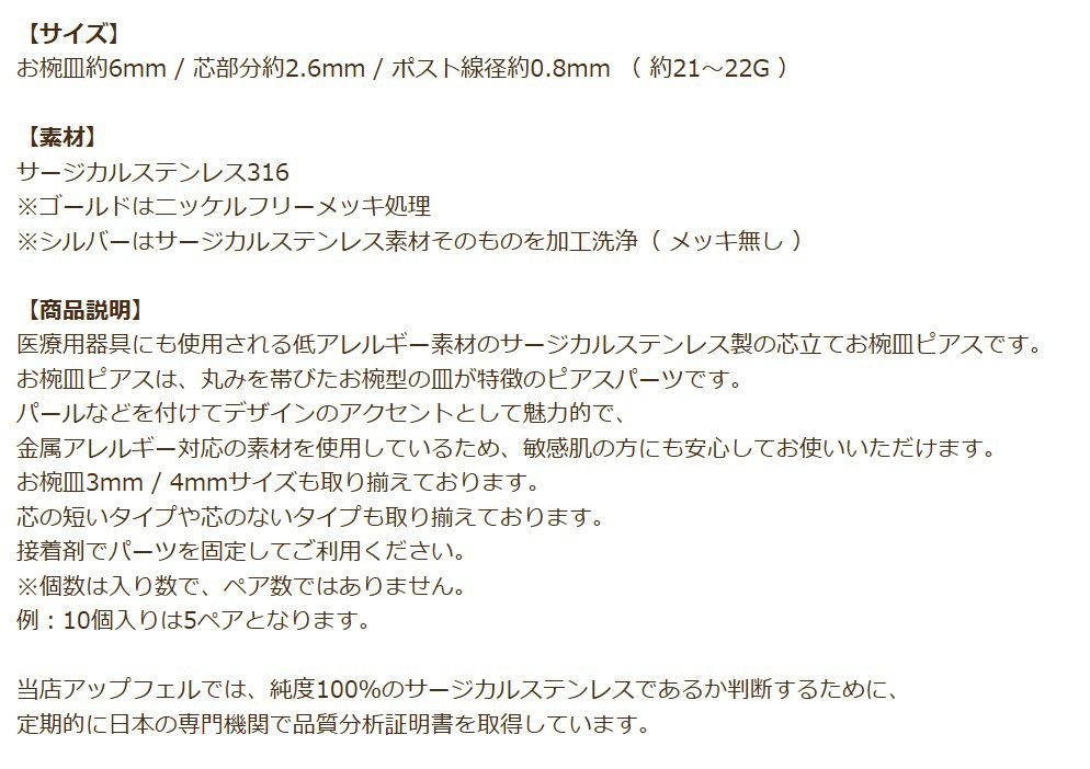 他の画像を見る 金アレ 316 素材 材料 ニッケルフリー 敏感肌 芯立 長い芯 [50個] * 長い * 芯有り お椀ピアス 6mm [ 銀 シルバー ] サージカルステンレス キャッチ付き パーツ 金属アレルギー対応 P1-04 当店特別価格 ¥ 4,270 税込 カートに入れる お気に入りに登録する