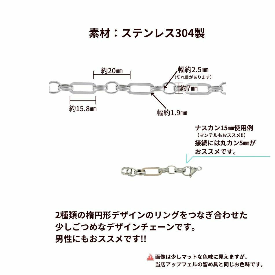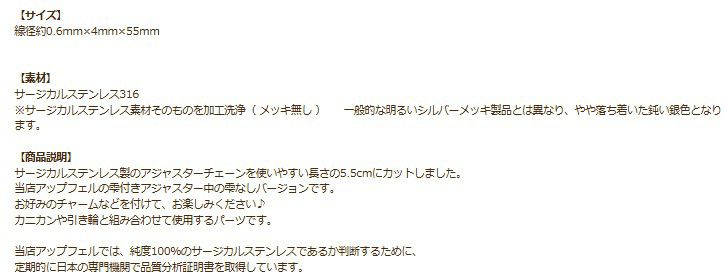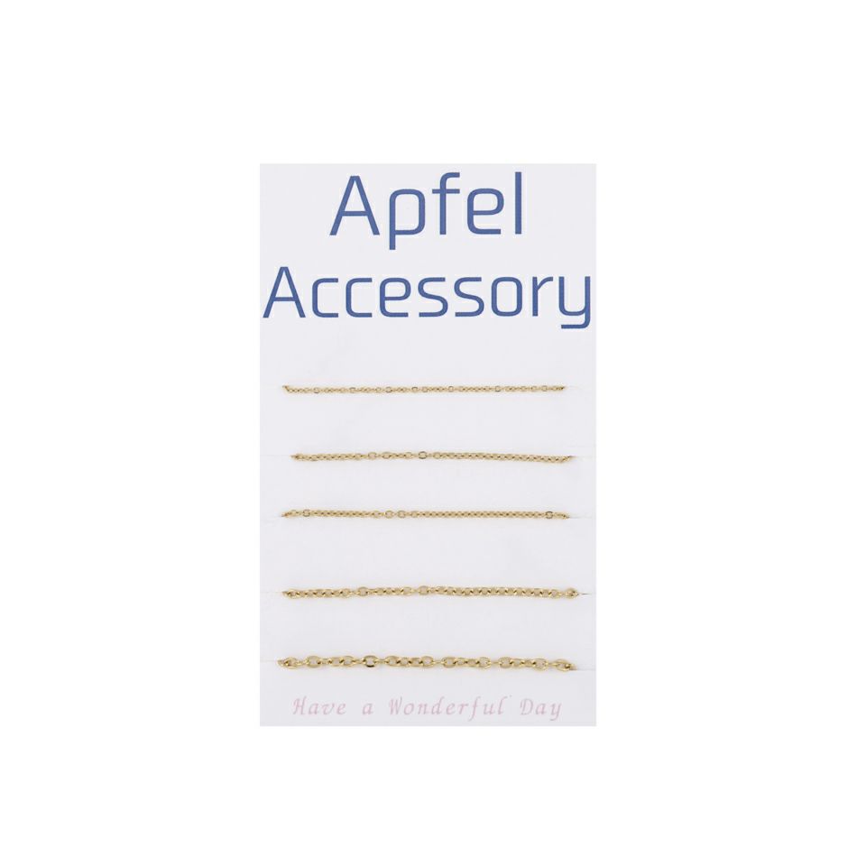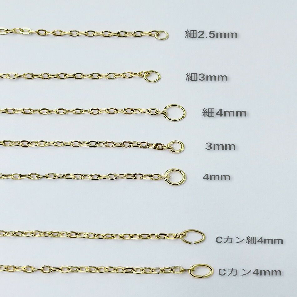 アップフェルが取り扱うネックレス用のチェーンパーツ(チェーン金具)は金属アレルギーの方でも安心してつけることができるサージカルステンレス316素材を採用しています。 ニッケルフリーの医療用ステンレス素材で製作しておりますので変色しにくく腐食しにくい為 安心してネックレスだけでなく、ピアス用チェーン、イヤーカフ用チェーン、ブレスレット、アンクレットなど 色々なアレンジにお使いいただけます。 代表的な小豆チェーンは形状から小判チェーンとも呼ばれ、細いものから太いもの、丸味を帯びたもの、平らなものなど様々なデザインを取り揃えています。重なりあったダブル小豆チェーンも存在感があります。 1.0mmの繊細なアズキチェーンはロングチェーンにしてイヤーカフにつけてもよいですし 太目のアズキチェーンであればメンズ向けのかっこいいイヤーカフチェーンを作ることができます。 また玉がついたアクセントのある小豆チェーンもございます。 スネークチェーンは細めはレディース向け、太目はメンズ向けのネックレスとして人気です。 色も18Kゴールドやシルバーのニッケルフリーのステンレス素材なので金属アレルギーの方にも安心です。 平らなフラットスネークチェーンはワイドスネークチェーンとも呼ばれ、チョーカーネックレスなどに ハンドメイドすることが可能です。 喜平チェーンパーツも切り売りですので40cm、45cm、50cm、60cmなどお好みにサイズにカットして引き輪、カニカンなどをつければハンドメイドのネックレスが簡単に作れます。 ベネチアンチェーンは四角い形状のコマが連なっているチェーンです。小豆チェーンと比べてコマとコマが交互に組み合わさり密度が高く、光が当たる面が大きいためキラキラと輝き高級感が増します。 コマのサイズは0.5mm、0.7mm、1.0㎜がありますのでレディースからメンズ用としてハンドメイド可能です。 また長さについては切り売りですので40cm、45cm、50cm、60cmなどお好みのサイズにしていただけます。 アクセサリーステンレスパーツのボールチェーンパーツは様々な太さを取り揃えています。 1.2mm、1.5mm、2mm、3mm、5mmがございます。 ボールチェーンにコネクターを付けてキーホルダー用としたり、花器を吊るチェインボールとしてもお使いいただけます。キラキラと輝くカットボールチェーンもネックレスのハンドメイドに活躍します。 フィガロチェーンは切り売りなので人気サイズ50cmネックレスもハンドメイド可能です。 カラーも18Kゴールド、シルバー、ピンクゴールドから選択できます。 スクリューチェーンパーツはらせん状に捻りがあるのが特徴で、その為光を反射する部分が多くキラキラと輝きます。 また柔らかい質感になっていますので着け心地が非常によく、ストレスがないのでレディースに人気のチェーンです。 デザイン的にもチャームなしでそのまま着けてもオシャレなネックレスになります。カジュアルなファッションでも、使い勝手の良いネックレスです。 ダブルスクリューチェーンパーツは太目のチェーンとしてより存在感のあるネックレスをハンドメイドできます。ネックレストップを何もつけなくてもネックレスとしてオシャレを楽しめます。18金ゴールドメッキは、イオンプレーティング加工の為変色しにくく長期間お使いいただけます。 チェーンメイル作りとして丸カンを1個1個繋ぎ合わせるのもハンドメイドの醍醐味ですが 丸カンチェーンパーツを使えばエンドパーツを接続するだけで簡単にネックレスが作れてしまいます。 スエッジチェーンは蛇チェーンにデザインが似ていますが、捻りがある流れるようなラインを形成するデザインチェーンです。 その他にも楕円デザインのオーバルチェーンパーツ フレンチロープチェーンパーツはしめ縄が編み込まれたように作られたチェーンです。 小さな丸カン(輪っか)を三重に繋ぎ合わせてロープのように編み組まれたネックレスチェーンとなります。 フレンチロープチェーンの中には、カットを入れたカットフレンチロープチェーンがあります。 カットにより面が増えるためキラキラと輝き、よりラグジュエリーさがプラスされます。 またロープチェーンパーツには、金具の中が空洞(パイプ構造)の状態のパイプロープチェーンもあります。 パイプロープは貴金属の中を中空にすることで軽さがありながらもボリュームがある為エレガントな印象があるデザインチェーンです。 花びらを意味するペタルチェーンは、チェーンのひとこまの中央を潰すことで面ができ、光を反射させるようなデザインチェーンです。面に光が集まることで輝きがキラキラと大きくなり、繊細で上品な雰囲気を醸し出します。 オーバルチェーンは楕円の金具が連なったチェーンです。ライスチェーン、フットボールチェーンとも呼んでいます。 重量があり存在感あるチェーンです。 ネックレス用のアジャスターチェーンパーツは切り売りですので作家さんの好みの長さ