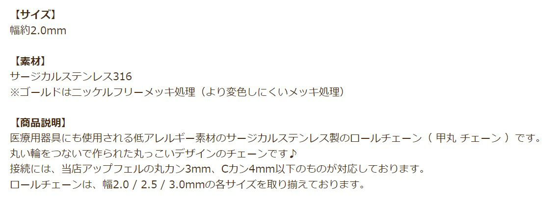 316 ロール チェーン 甲丸チェーン * 小 2.0mm * [ ゴールド 金 ] サージカルステンレス ロロチェーン パーツ 金属アレルギー対応 C1-01