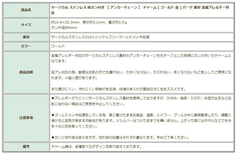 商品名 サージカル ステンレス 両カン付き 【 アンカーチェーン 】 チャーム [ ゴールド 金 ] パーツ 素材 金属アレルギー対応