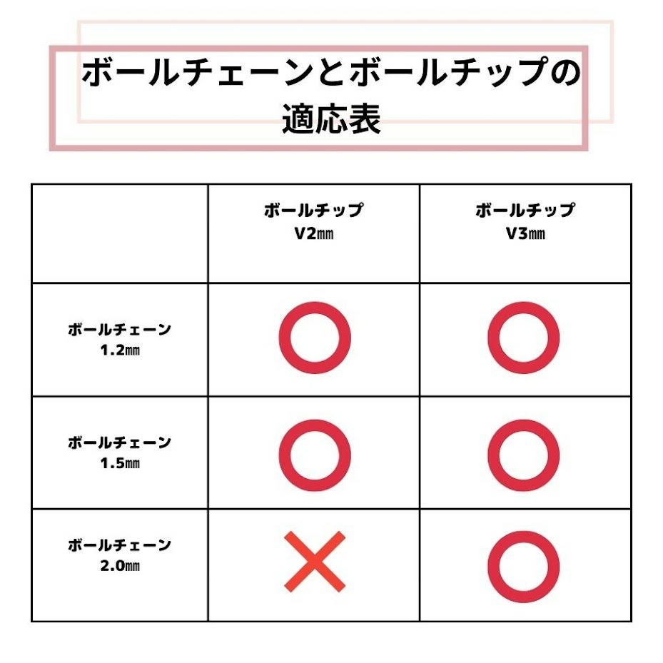 カップリングと当店アップフェルのボールチェーンの適応表