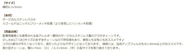 波小豆チェーンは、幅5×7mm (小) / 6.3×9mm (中)の各サイズを取り揃えております。
