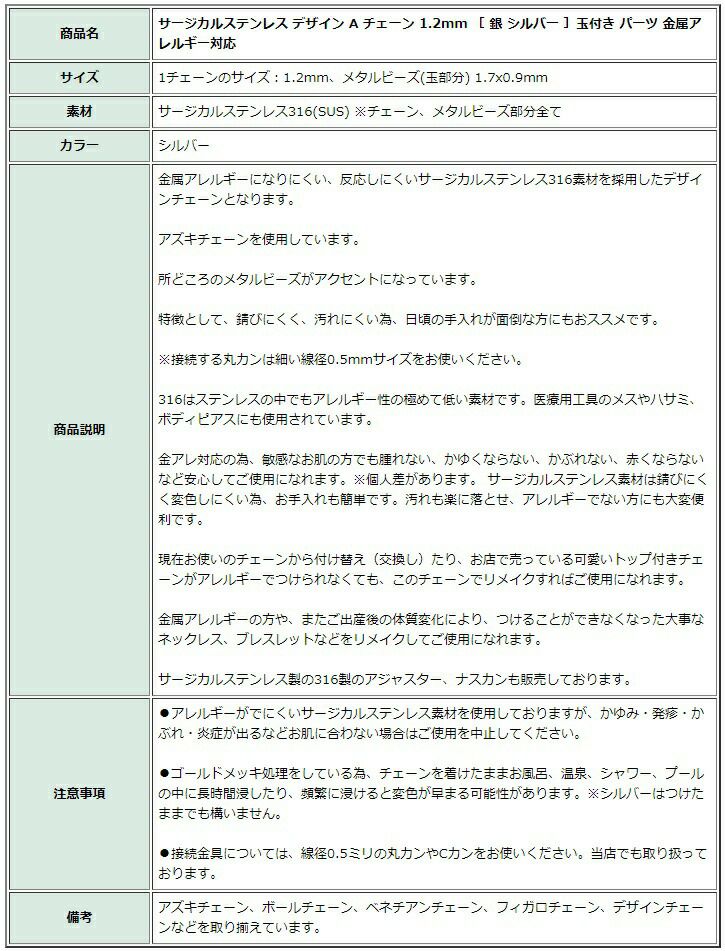 サージカルステンレス デザイン A チェーン 1.2mm [ 銀 シルバー ]玉付き パーツ 金属アレルギー対応 |