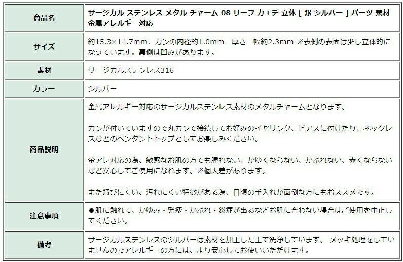 商品名 サージカル ステンレス メタル チャーム 08 リーフ カエデ 立体 [ 銀 シルバー ] パーツ 素材 金属アレルギー対応