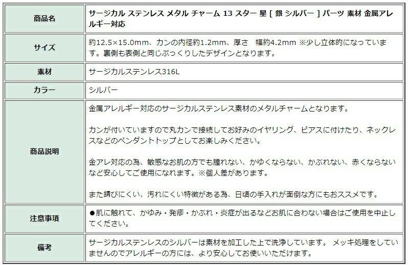 商品名 サージカル ステンレス メタル チャーム 13 スター 星 [ 銀 シルバー ] パーツ 素材 金属アレルギー対応