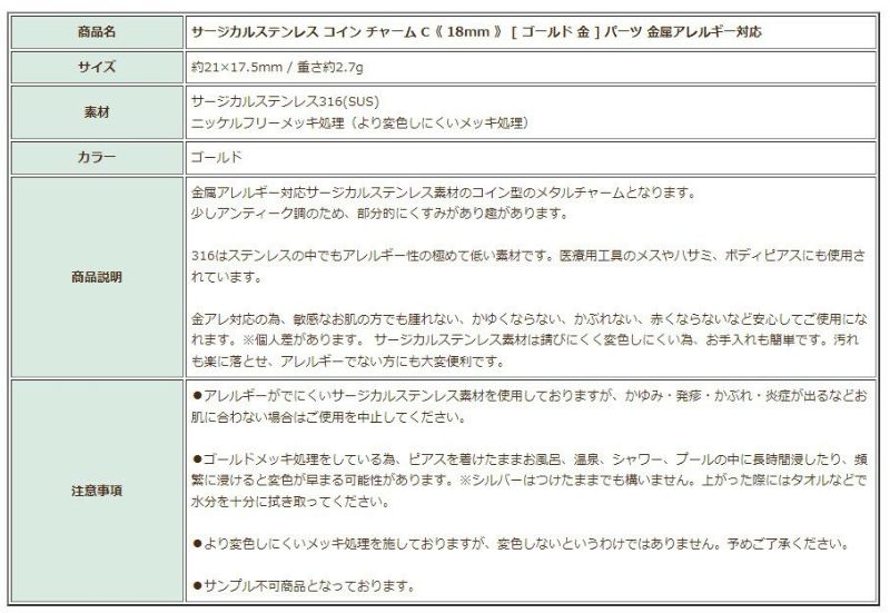 商品名 サージカルステンレス コイン チャーム C《 18mm 》 [ ゴールド 金 ] パーツ 金属アレルギー対応