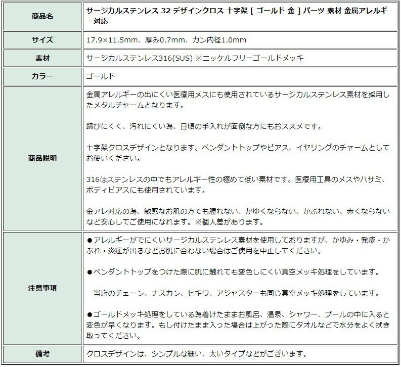 他の画像を見る 金アレ 医療用 316 金具 さびにくい ペンダントトップ 真空 [5個] サージカルステンレス チャーム 32 デザインクロス 十字架 [ ゴールド 金 ] O-01 パーツ 素材 金属アレルギー対応 当店特別価格 ¥ 499 税込 カートに入れる お気に入りに登録する