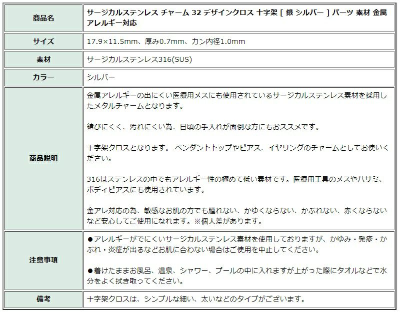 他の画像を見る 金アレ 医療用 316 金具 さびにくい ペンダントトップ 真空 [10個] サージカルステンレス チャーム 32 デザインクロス 十字架 [ 銀 シルバー ] O-01 パーツ 素材 金属アレルギー対応 当店特別価格 ¥ 300 税込 在庫切れ 再入荷お知らせ お気に入りに登録する