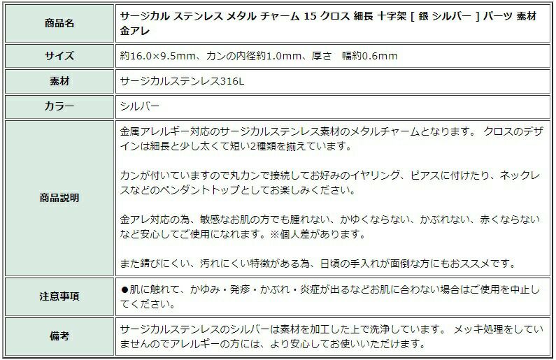 他の画像を見る SUS 316 L 金アレ モチーフ チャーム 素材 手芸 レジン [10個] サージカル ステンレス メタル チャーム 15 クロス 細長 十字架 [ 銀 シルバー ] パーツ 素材 金属アレルギー対応 当店特別価格 ¥ 300 税込 カートに入れる お気に入りに登録する