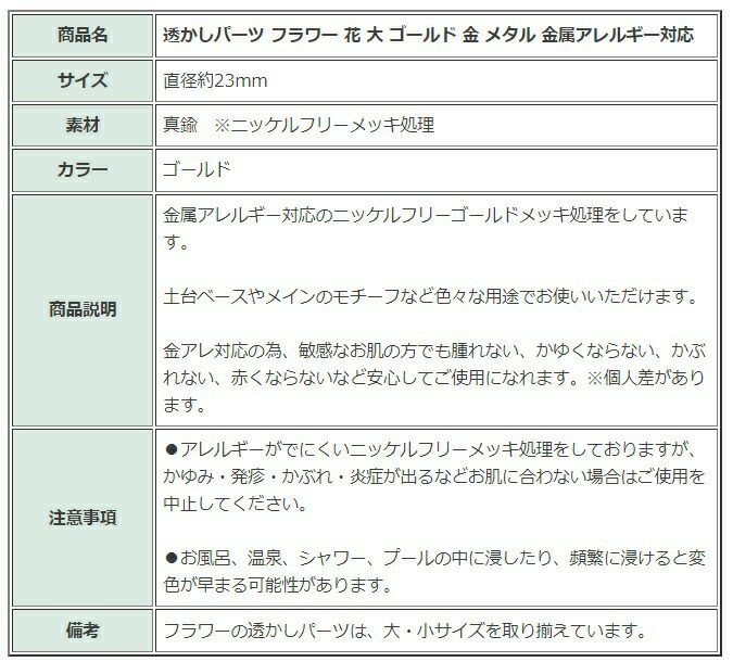 他の画像を見る ニッケルフリー 金アレ モチーフ チャーム 土台 素材 手芸 レジン [5枚]透かしパーツ フラワー花 大 [ ゴールド 金 ] 台座 パーツ 金属アレルギー対応 当店特別価格 ¥ 312 税込 在庫切れ 再入荷お知らせ お気に入りに登録する
