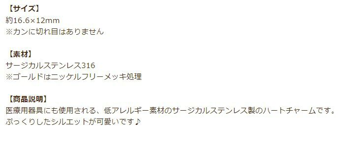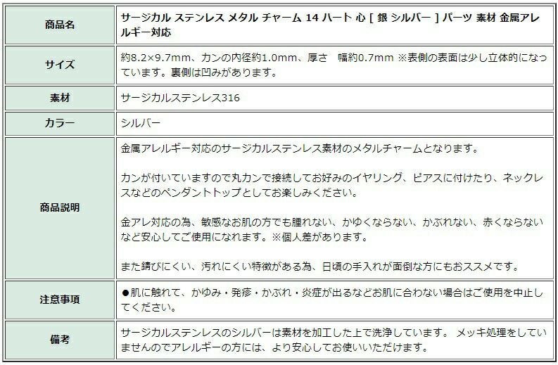 他の画像を見る SUS 316 L 金アレ モチーフ チャーム 素材 手芸 レジン [10個] サージカル ステンレス メタル チャーム 14 ハート 心 [ 銀 シルバー ] パーツ 素材 金属アレルギー対応 当店特別価格 ¥ 300 税込 カートに入れる お気に入りに登録する