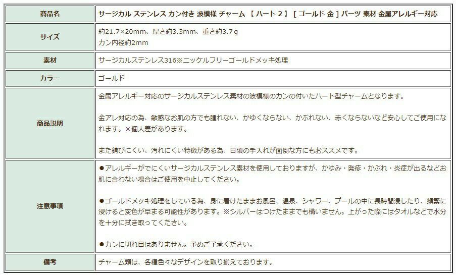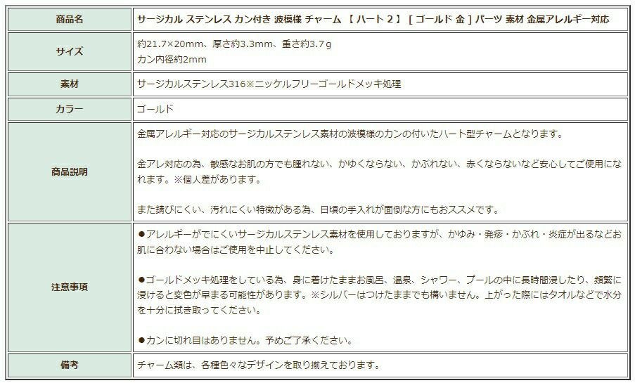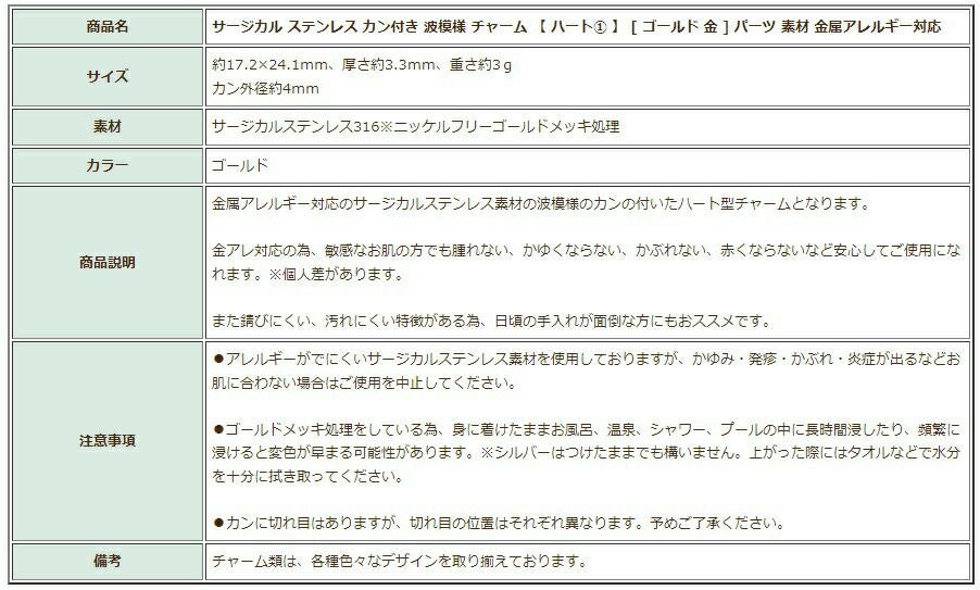 他の画像を見る 金アレ 316 チャーム ニッケルフリー 波模様 ハート 敏感肌 [ 1個 ] サージカル ステンレス カン付き 波模様 チャーム 【 ハート 2 】 [ ゴールド 金 ] パーツ 素材 金属アレルギー対応 当店特別価格 ¥ 399 税込 在庫切れ 再入荷お知らせ お気に入りに登録する