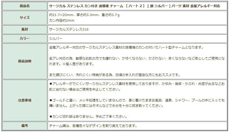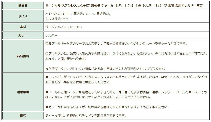 他の画像を見る 金アレ 316 チャーム ニッケルフリー 波模様 ハート 敏感肌 [ 1個 ] サージカル ステンレス カン付き 波模様 チャーム 【 ハート 1 】 [ 銀 シルバー ] パーツ 素材 金属アレルギー対応 当店特別価格 ¥ 299 税込 カートに入れる お気に入りに登録する