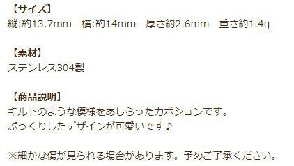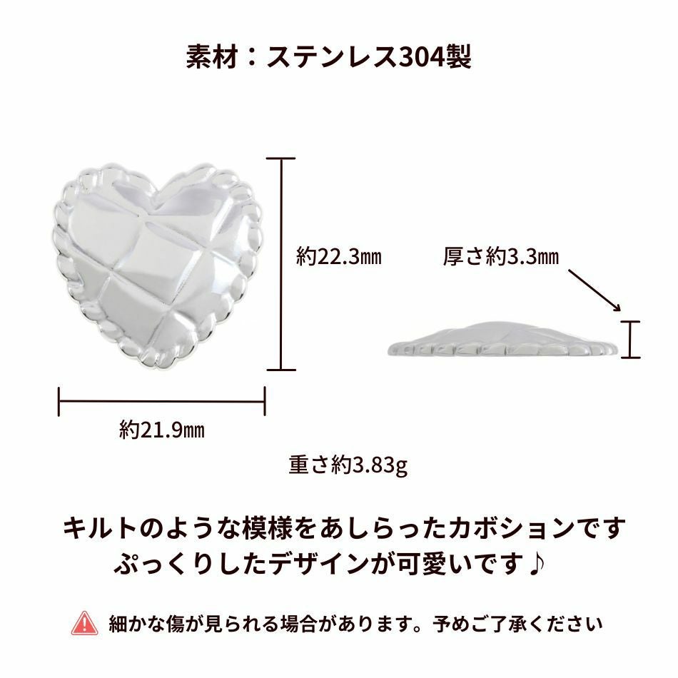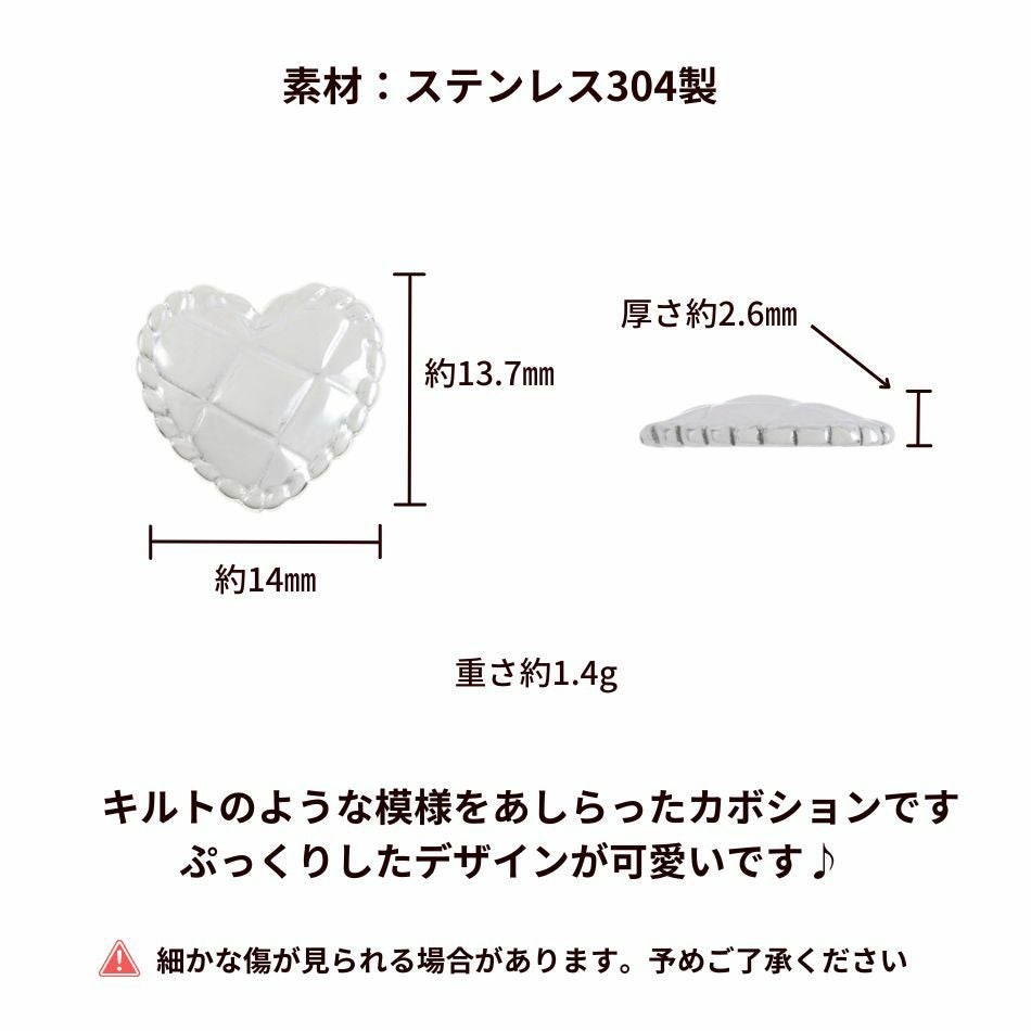 他の画像を見る 金アレ 素材 材料 ニッケルフリー 敏感肌 貼付 セッティング [4個] 304 カボション K1002 キルトハート *大* [ 銀 シルバー ] ステンレス パーツ 貼付 セッティング キュート ラブ 金属アレルギー対応 O-03 当店特別価格 ¥ 399 税込 カートに入れる お気に入りに登録する