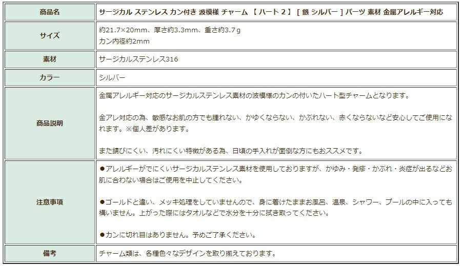 他の画像を見る 金アレ 316 チャーム ニッケルフリー 波模様 ハート 敏感肌 [ 1個 ] サージカル ステンレス カン付き 波模様 チャーム 【 ハート 2 】 [ 銀 シルバー ] パーツ 素材 金属アレルギー対応 当店特別価格 ¥ 369 税込 カートに入れる お気に入りに登録する