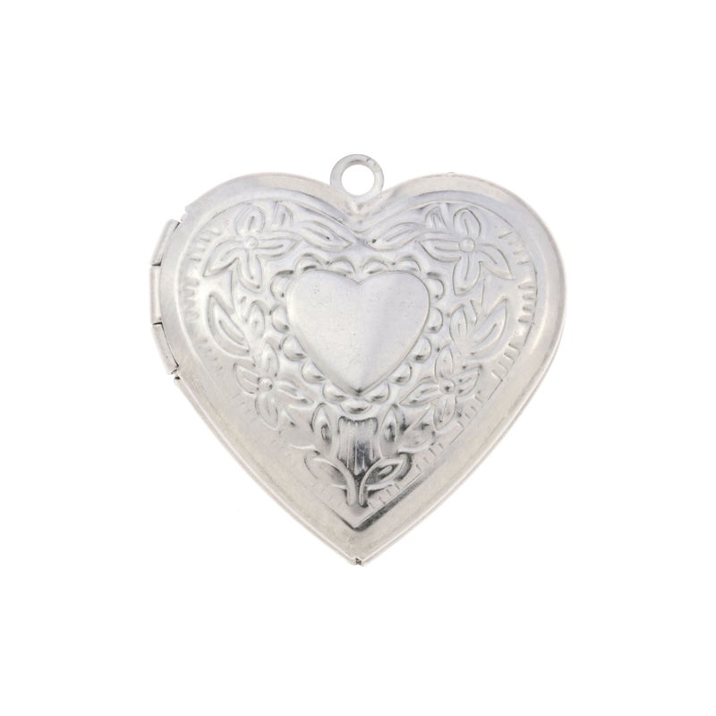 金属アレルギー対応のサージカルステンレス素材のハート型のロケットチャームとなります。表面には、繊細なリーフのモチーフが施されています。