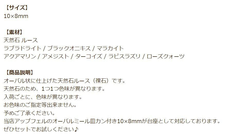 他の画像を見る パワーストーン ストーン 天然石 オーバル 裸石 宝石 [ 1個 ] 天然石 ルース オーバル 10×8mm ラブラドライト ブラックオニキス マラカイト アクアマリン アメジスト ターコイズ ラピスラズリ ローズクォーツ O-05 当店特別価格 ¥ 979 税込 〜 当店特別価格 ¥ 税込 詳細を見る お気に入りに登録する