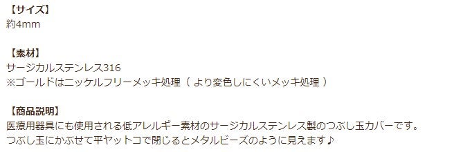[10個] [ つぶし玉 * カバー * ] * 4mm * [ ゴールド 金 ] サージカルステンレス カシメ玉 アクセサリー パーツ 金属アレルギー対応 M1-06