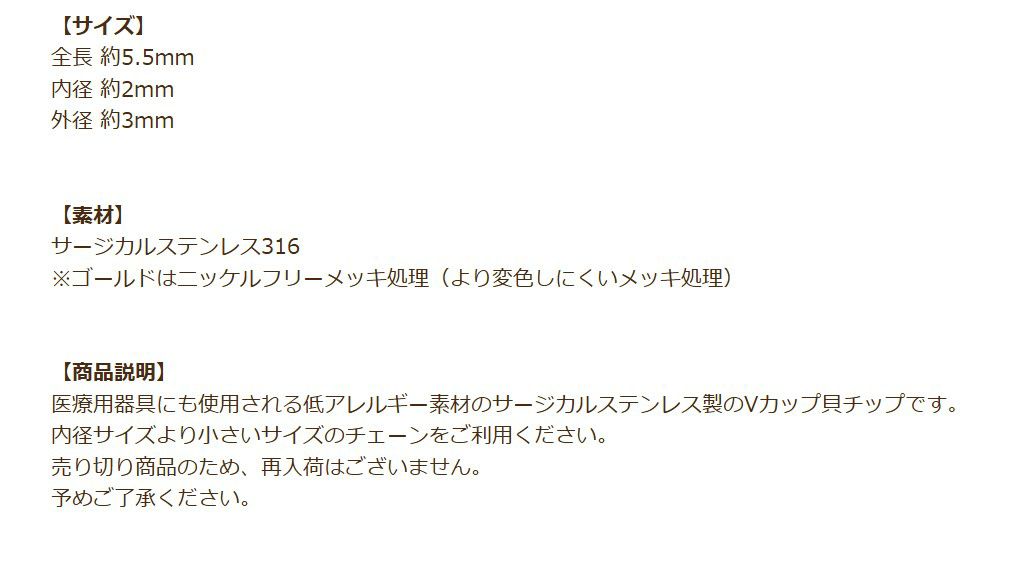 他の画像を見る 金アレ 医療用 素材 お手入れ簡単 316 金色 素材 金具 [10個] Vカップ 2 mm [ ゴールド 金 ] サージカルステンレス ボールチェーン 用 ボールチップ 貝チップ パーツ 金属アレルギー対応 M1-06 当店特別価格 ¥ 349 税込 カートに入れる お気に入りに登録する