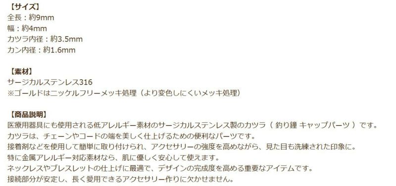 [ 4個 ] カン付き * カツラ * 中 3.5mm [ ゴールド 金 ] サージカルステンレス 紐留め 革紐 キャップ エンドパーツ 金属アレルギー対応 M1-05
