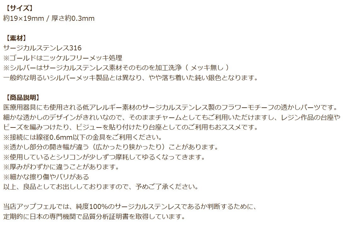 他の画像を見る 金属アレルギー 医療用 素材 お手入れ簡単 316L [10個]サージカルステンレス 花 座金 小 8mm [ 銀 シルバー ] パーツ 金属アレルギー 対応 当店特別価格 ¥ 249 税込 カートに入れる お気に入りに登録する