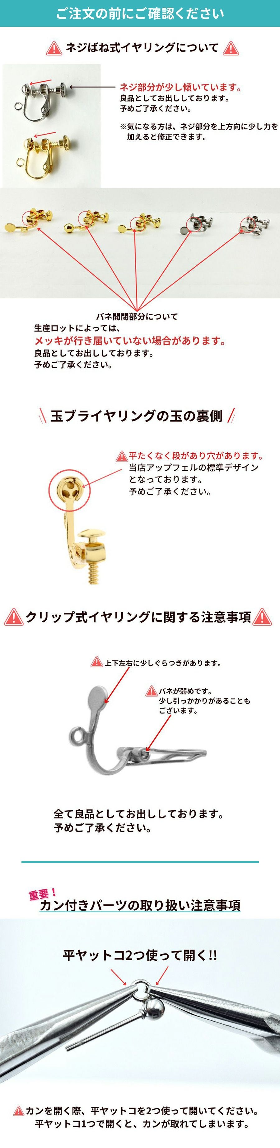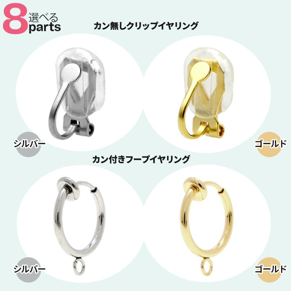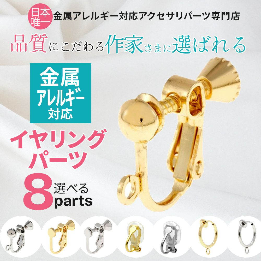 長時間つけても痛くない落ちにくい調整ができるネジバネ式イヤリングパーツ、耳たぶの接着面積が小さくバネが弱めのクリップ式イヤリングパーツ、バネで耳たぶを挟むフープ式イヤリングパーツです。