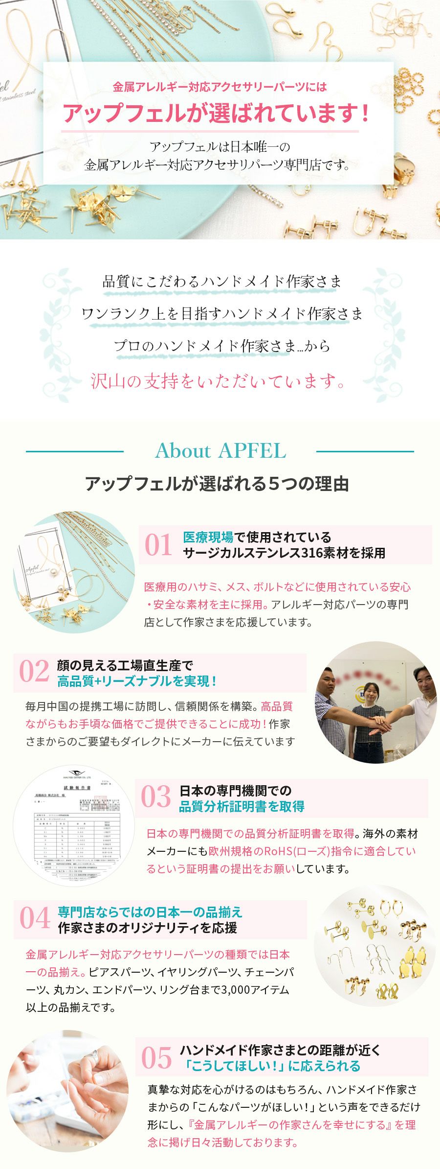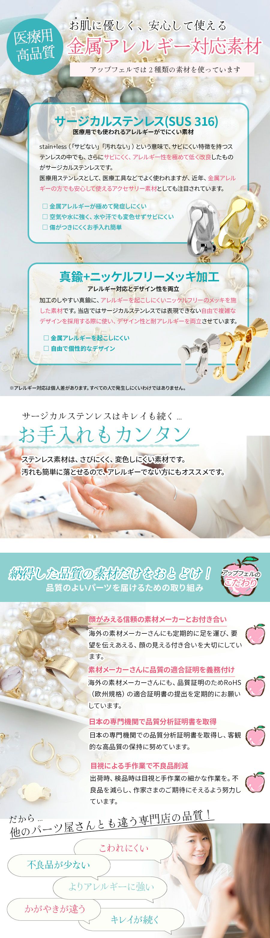 アップフェルが取り扱うステンレスのイヤリングパーツ(イヤリング金具)は金属アレルギーの方でも安心してつけることができるニッケルフリー真鍮素材やサージカルステンレス316素材を採用しています。