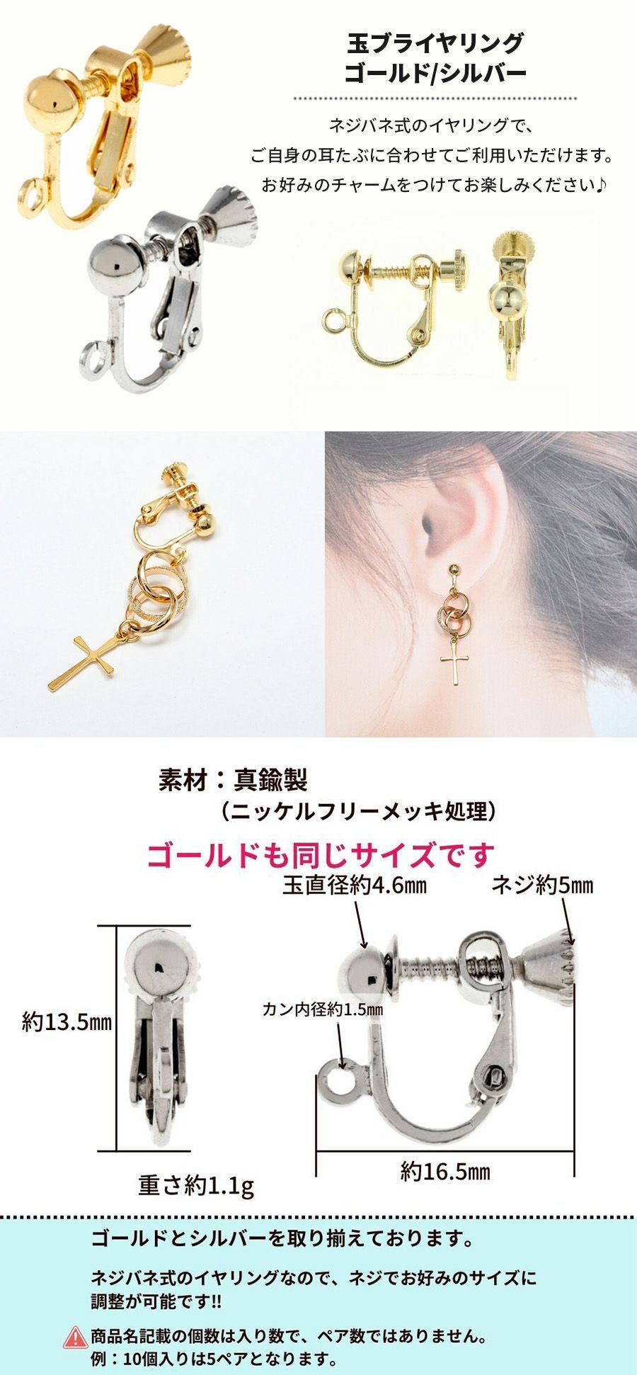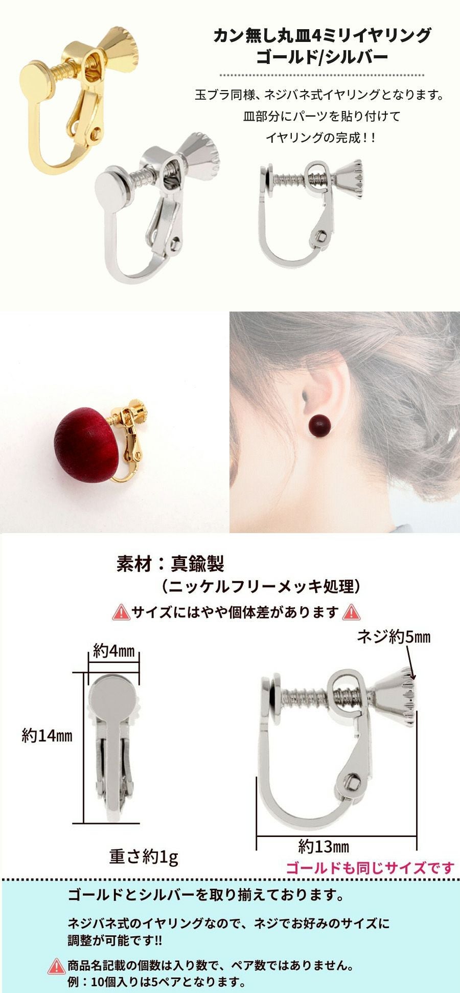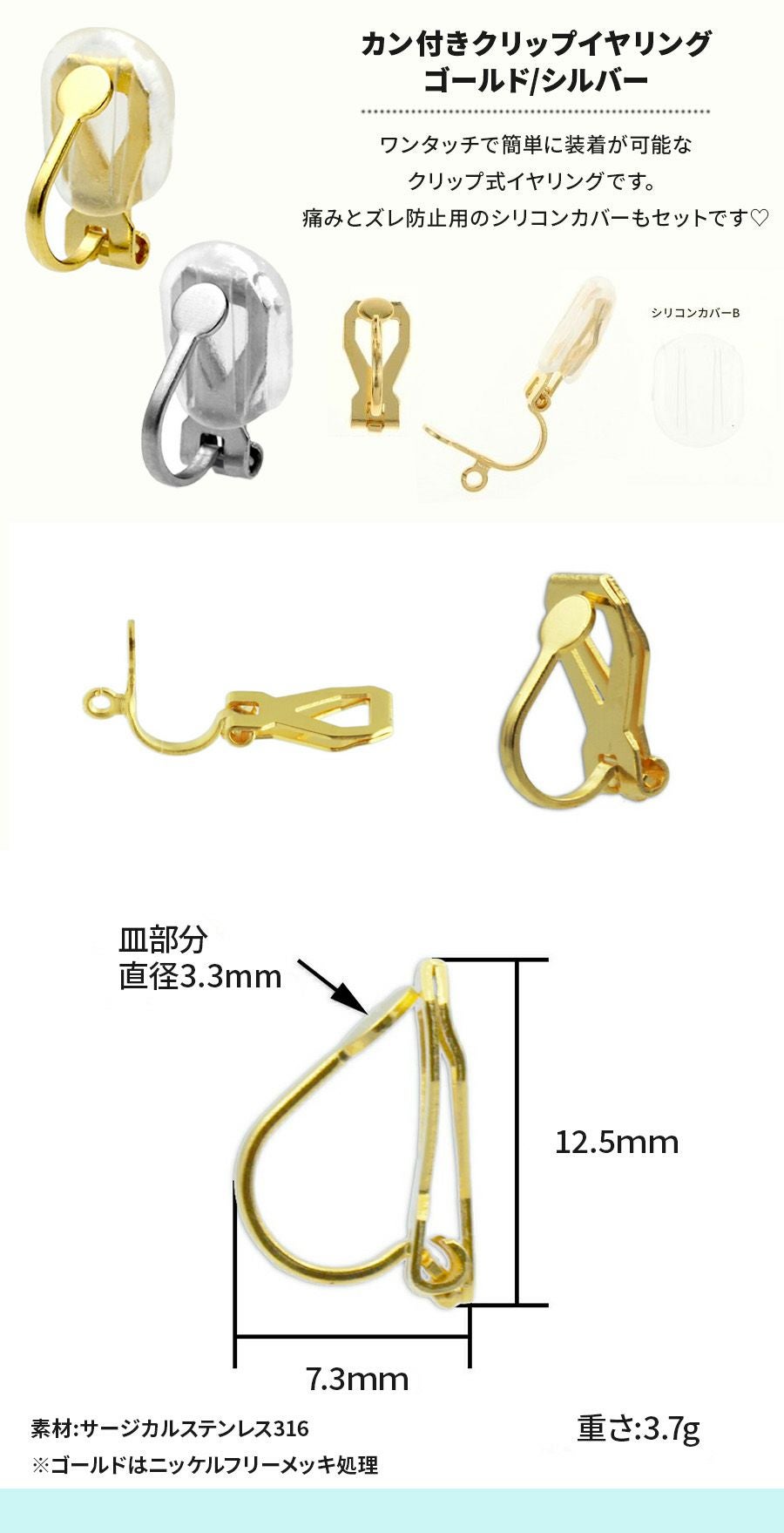 ネジバネ式、フープ式、クリップ式、蝶バネ式のイヤリングパーツにお使いください。また紛失しやすいのでスペア用として準備するのもおすすめです。