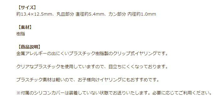 金属アレルギーの出にくいプラスチック樹脂製のクリップ式イヤリングです。