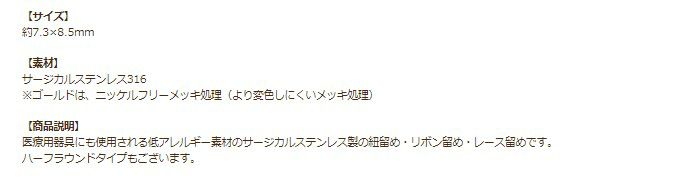 他の画像を見る 金アレ 医療用 素材 316 金具 資材 さびにくい 小さい [10個] リボン留め 6.5mm [ ゴールド 金 ] サージカルステンレス ヒモ留め レース留め ワニ口 パーツ 金属アレルギー対応 M2-05 当店特別価格 ¥ 429 税込 カートに入れる お気に入りに登録する
